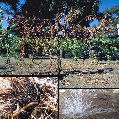 Συχνότερα εμφανίζεται όταν ένα αμπέλι αντικαθιστά προσβεβλημένα οπωροφόρα ή όταν ένας χώρος αμπελιού σε μια δασώδη περιοχή έχει πρόσφατα καθαριστεί. Η Armillaria mellea επηρεάζει τις ρίζες του αμπελιού. Η βλαβη συνήθως εμφανίζεται σε μικρά τμήματα των αμπελιών.
