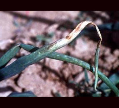 Ο μύκητας προσβάλλει τα φύλλα, τα στελέχη και τους βολβούς. Τα φυτά παρουσιάζουν παραμορφωμένο φύλλωμα ανοικτού πρασίνου χρώματος μέχρι κίτρινου, με διάσπαρτες χλωρωτικές τεφροπράσινες ή υπόλευκες κηλιδώσεις ή ραβδώσεις, οι οποίες αργότερα καλύπτονται από τεφρώδη εξανθηση (σποριάγγεια).Τα προσβεβλημένα φύλλα ξεραίνονται από την κορυφή προς την βάση.