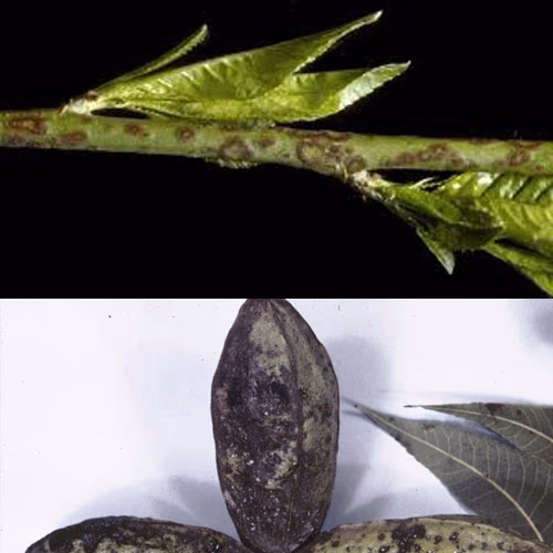 Συμπτώματα: Στους πράσινους βλαστούς εμφανίζονται ελλειψοειδείς κηλίδες, διαμέτρου 1-3 mm, ελαφρά υπερυψωμένες, καστανόμαυρες μέχρι μαύρες, «βελούδινης» υφής. Στα φύλλα και τους καρπούς τα συμπτώματα εμφανίζονται αργότερα.