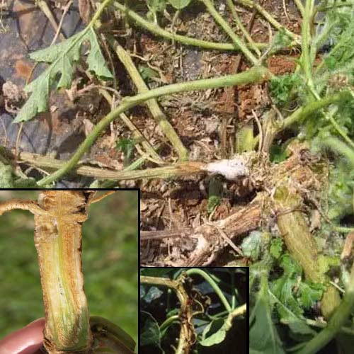 F. oxysporum: Προκαλεί τήξεις σπορόφυτων, σηψηρριζία σε νεαρά φυτάρια και αδροφουζαρίωση στη καρπουζιά. Τα συμπτώματα εμφανίζονται κι εδώ με μορφή ημιπληγίας ή αποπληξίας, κιτρίνισμα των φύλλων και καστανό χρωματισμό στο εσωτερικό του βλαστού. Σε προχωρημένο στάδιο παρατηρείται και σήψη ριζών. Με υγρό καιρό εμφανίζονται τα ρόδινα σπόρια του μύκητα στην επιφάνεια του βλαστού.