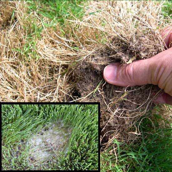 Συμπτώματα: Το γρασίδι παρουσιάζει μεγάλες διάσπαρτες κίτρινο-καφέ κηλίδες διαμέτρου 5εκ έως 30εκ που καταλήγουν σε κενά στο έδαφος. Συνήθως εμφανίζεται κατά τα νεαρά στάδια του γρασιδιού και όταν η θερμοκρασία είναι υψηλή. Σε περιόδους υψηλής υγρασίας καλύπτονται απο άσπρο μυκήλιο. Η προσβολή της ρίζας προκαλεί μειώση της ανάπτυξης και παρατηρείται στο λαιμό και το ριζικό σύστημα αλλαγή χρώματος.