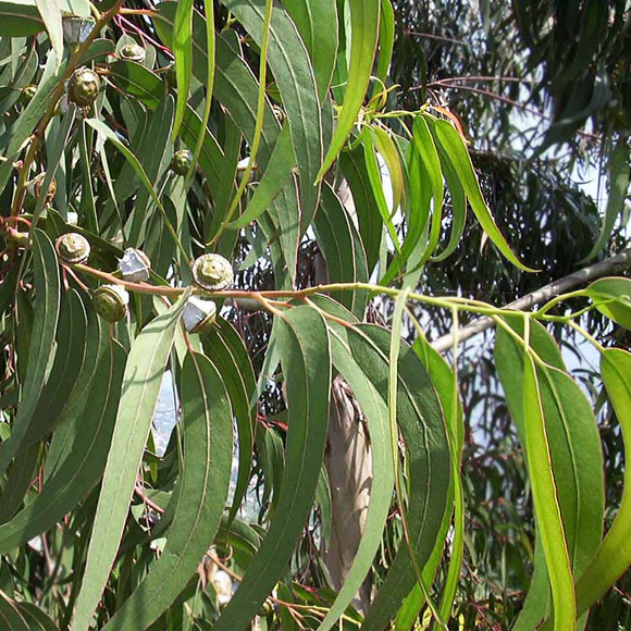 🔹 Τα φύλλα είναι λογχοειδή, αρωματικά λόγω της υψηλής περιεκτικότητας σε ευκαλυπτόλη.