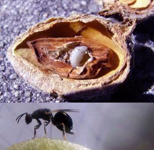 Το έντομο ευρύτομο έχει μια γενιά το έτος και διαχειμάζει με την μορφή της προνύμφης μέσα σε ξερά αμύγδαλα που παραμένουν μαυρισμένα πάνω στο δένδρο ή στο έδαφος από το προηγούμενο χρόνο. Τα ενήλικα εμφανίζονται την άνοιξη (από Μάρτιο έως Μάιο ανάλογα την περιοχή και τις καιρικές συνθήκες). Το θηλυκό ωοτοκεί (1-2 ημέρες μετά την έξοδό του)τα αβγά στα τρυφερά αμύγδαλα. Η οπή ωοτοκίας δεν είναι εξωτερικά ορατή αν και σε ορισμένες ποικιλίες (Ρέτσου) η παρουσία της προδίδεται από έκκριση κόμμεος στην περιοχή του νύγματος ωοτοκίας. Λίγες μέρες αργότερα από το αβγό βγαίνει η νεαρή προνύμφη που τρέφεται από το σπέρμα(κοτυληδόνες) το οποίο και καταστρέφει. Έτσι τα αμύγδαλα πέφτουν πρόωρα ή παραμένουν στο δένδρο μαυρισμένα.