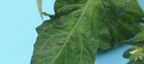 Συμπτώματα: Τα φύλλα γίνονται σκούρα πράσινα με χλωρωτικές ανοιχτόχρωμες κηλίδες κατά μήκος των νεύρων, στη μέση του ελάσματος του φύλλου. Ο ιστός του φύλλου εμφανίζει μια ελαφρώς κοίλο προς τα κάτω.
