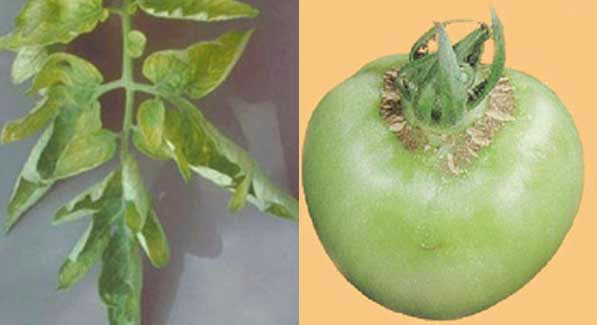 Συμπτώματα: Ο καρπός της τομάτας εμφανίζει παραμορφώσεις, οι βλαστός δεν αναπτύσσεται σωστά και σε πιο σοβαρές περιπτώσεις νεκρώνεται στις άκρες. Στα κλαδιά οι μίσχοι γίνονται άκαμπτοι. Τα νέα άνθη πεθαίνουν και μειώνεται η ανάπτυξη. Αναπτύσσονται τα πλευρικά κλαδιά εμποδίζοντας την ανάπτυξη του φυτού σε ύψος. Τα φύλλα αποκτούν έντονη χροιά από μωβ, καφέ και κίτρινο χρώμα, είναι παχιά και εύθρυπτα. Οι καρποί της τομάτας δεν έχουν σπόρους και παρουσιάζουν φελώδη υφή. Η ωρίμανση δεν είναι ομοιόμορφη και οι καρποί δεν "δένουν".