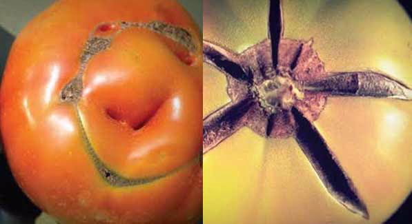 Εμφανίζετε σε πρώιμες καλλιέργειες, σε καλλιέργειες όπου έχει γίνει υπερβολική αζωτούχα λίπανση, σε καλλιέργειες που έχουν γίνει υπερβολικά ποτίσματα και σε καλλιέργειες που έχουν εκτεθεί σε περίοδο χαμηλών νυχτερινών θερμοκρασιών. Παραμόρφωση καρπών μπορει επίσης να υπάρξουν και από χρήση μεγάλης δόσης καρποδετικής ορμόνης.