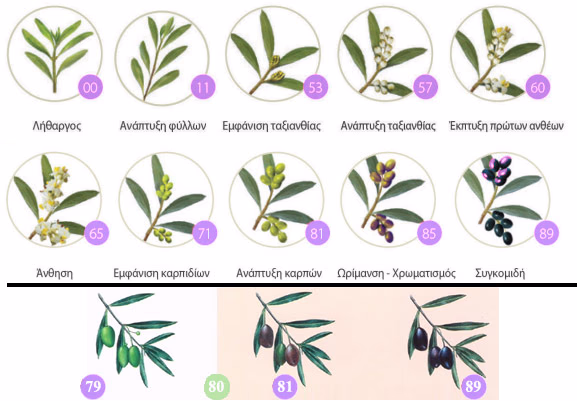 | Στάδιο BBCH | Περιγράφη | 00 | Οι οφθαλμοί στην κορυφή των βλαστών που αναπτύχθηκαν την προηγούμενη καλλιεργητική χρονιά είναι τελείως κλειστοί. Bud development: Foliar buds at the apex of shoots grown the previous crop-year are completely closed, sharp-pointed, stemless and ochre-coloured. | 01 | Οι οφθαλμοί αρχίζουν να διογκώνονται και να ανοίγουν Bud development: Foliar buds start to swell and open, showing the new foliar primordia. | 03 | Οι οφθαλμοί επιμηκύνονται και διαχωρίζονται από τη βάση Bud development: Foliar buds lengthen and separate from the base. | 07 | Εξωτερικά μικρά φύλλα ανοιχτά, όχι τελείως διαχωρισμένα, παραμένοντας ενωμένα με κορυφές Bud development: External small leaves open, not completely separated, remaining joined by apices. | 09 | Εξωτερικά μικρά φύλλα ανοίγουν περαιτέρω με τις άκρες τους να διασταυρώνονται μεταξύ τους Bud development: External small leaves opening further with their tips inter crossing. | 10 | Ανάπτυξη φύλλων | 11 | Τα πρώτα φύλλα είναι διαχωρισμένα με γκρι-πράσινο χρώμα Leaf development: First leaves completely separated. Grey-greenish coloured. | 15 | Τα φύλλα είναι διαχωρισμένα χωρίς να έχουν φτάσει στο τελικό τους μέγεθος. Τα πρώτα φύλλα γίνονται πρασινωπά στην πάνω πλευρά. Leaf development: The leaves are more separated without reaching their final size. First leaves turn greenish on the upperside. | 19 | Τα φύλλα έχουν το τυπικό μέγεθος και σχήμα. Leaf development: Leaves get the typical variety size and shape. | 30 | Ανάπτυξη βλαστών | 31 | Ανάπτυξη βλαστών: Οι βλαστοί φτάνουν το 10% του τελικού μεγέθους. Shoot development: Shoots reach 10% of final size. | 33 | Ανάπτυξη βλαστών: Οι βλαστοί φτάνουν το 30% του τελικού μεγέθους. Shoot development: Shoots reach 30% of final size. | 37 | Ανάπτυξη βλαστών: Οι βλαστοί φτάνουν το 70% του τελικού μεγέθους. Shoot development: Shoots reach 70% of final size. | 50 | Εμφάνιση ταξιανθίας: Τα μπουμπούκια ταξιανθίας στις μασχάλες των φύλλων είναι εντελώς κλειστά. Είναι μυτερά, χωρίς μίσχο και χρώμα ώχρας. Inflorescence emergence: Inflorescence buds in leaf axiles are completely closed. They are sharp-pointed, stemless and ochre-coloured. | 51 | Εμφάνιση ταξιανθίας: Τα μπουμπούκια ταξιανθίας αρχίζουν να διογκώνονται Inflorescence emergence: Inflorescence buds start to swell on its stem. | 52 | Εμφάνιση ταξιανθίας: Ξεκινά η ανάπτυξη συστάδων ανθέον. Inflorescence emergence: Inflorescence buds open. Flower cluster development starts. | 54 | Εμφάνιση ταξιανθίας: Ανάπτυξη συστάδων Inflorescence emergence: Flower cluster growing | 55 | Εμφάνιση ταξιανθίας: Η συστάδα λουλουδιών έχει διευρυνθεί πλήρως. Τα μπουμπούκια των λουλουδιών αρχίζουν να ανοίγουν. Inflorescence emergence: Flower cluster totally expanded. Floral buds start to open. | 57 | Εμφάνιση ταξιανθίας: Το στέμμα, πράσινου χρώματος, είναι μακρύτερο από τον κάλυκα. Inflorescence emergence: The corolla, green-coloured, is longer than calyx. | 59 | Εμφάνιση ταξιανθίας: Το χρώμα του στεφάνη αλλάζει από πράσινο σε λευκό. Inflorescence emergence: The corolla changes from green to white colour. | 60 | Ανθοφορία: Ανοίγουν τα πρώτα άνθοι Flowering: First flowers open. | 61 | Ανθοφορία: Το 10% των ανθέων ανοίγει. Flowering: Beginning of flowering: 10% of flowers open. | 65 | Ανθοφορία: Το 50% των ανθέων ανοίγει. Flowering: Full flowering: at least 50% of flowers open. | 67 | Ανθοφορία: Πέφτουν πρώτα πέταλα. Flowering: First petals falling. | 68 | Ανθοφορία: Η πλειονότητα των πετάλων είναι πεσμένα ή ξεθωριασμένα Flowering: Majority of petals fallen or faded. | 69 | Τέλος ανθοφορίας, καρπόδεση, οι μη γονιμοποιημένες ωοθήκες είναι πεσμένες Flowering: End of flowering, fruit set, non-fertilized ovaries fallen. | 70 | Ανάπτυξη καρπού | 71 | Ανάπτυξη καρπού: Μέγεθος καρπού περίπου 10% του τελικού μεγέθους. Fruit development: Fruit size about 10% of final size. | 73 | Μέγεθος καρπού περίπου 30% του τελικού μεγέθους. | 75 | Ανάπτυξη καρπού: Μέγεθος καρπού περίπου 50% του τελικού μεγέθους (δείχνει αντίσταση στην κοπή). Fruit development: Fruit size about 50% of final size. Stone starts to lignificate (it shows cutting resistance). | 78 | Μέγεθος καρπού περίπου 80% του τελικού μεγέθους. O καρπός είναι ένα στάδιο πριν την καταλληλόλητα για το μάζεμα πράσινης ελιάς. | 79 | 