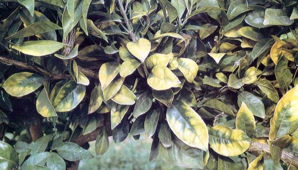 Γενικά συμπτώματα για όλα τα εσπεριδοειδή: Η ανεπάρκεια μαγνησίου προκαλεί αρχικά κιτρινίσματα στα παλαιότερα φύλλα, δηλαδή στα κατώτερα τμήματα των βλαστών. Ο αποχρωματισμός ξεκινάει μεταξύ του κεντρικού νεύρου του φύλου και των άκρων, επεκτείνετε από τις άκρες των φύλλων και το περιθώριο των φύλλων. Το κίτρινο αυτό εξάνθημα μπορεί να μεγαλώσει και να πάρει τη μορφή ανεστραμμένου V. Αυτές οι περιοχές γίνονται εντελώς κίτρινες, μαζί και οι νευρώσεις. Στη συνέχεια, χλώρωση προχωρά προς το μίσχο. Η βάση των φύλλων παραμένει πράσινη για το μεγαλύτερο χρονικό διάστημα.