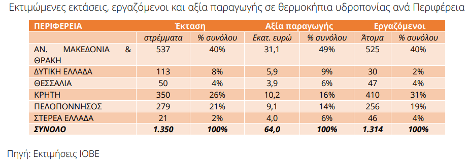 Σύμφωνα με τη μελέτη του ΙΟΒΕ «Η θερμοκηπιακή γεωργία εκτός εδάφους στην Ελλάδα (ΘΓΕΕ): Προκλήσεις, προοπτικές και οι περιπτώσεις της Στερεάς και Βόρειας Ελλάδας», η έκταση των υδροπονικών θερμοκηπίων κηπευτικών στη χώρα εκτιμάται σήμερα περίπου στα 1.350 στρέμματα. Στη μελέτη αναφέρεται ότι, λαμβάνοντας υπόψη ήδη ανακοινωμένες επεκτάσεις και νέες επενδύσεις, η έκταση αυτή μπορεί σε πρώτη φάση να αυξηθεί στα 1.700–2.000 στρέμματα τα επόμενα χρόνια.