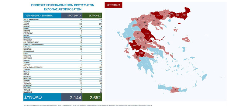 Το Υπουργείο Αγροτικής Ανάπτυξης και Τροφίμων ενημερώνει ότι, σύμφωνα με τα επικαιροποιημένα συγκεντρωτικά στοιχεία της Εθνικής Επιστημονικής Επιτροπής Διαχείρισης και Ελέγχου της Ευλογιάς, για το διάστημα Αυγούστου 2024 – 29 Μαρτίου 2026 έχουν καταγραφεί συνολικά: