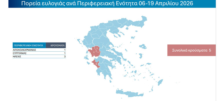 Για το διάστημα 6 έως 19 Απριλίου 2026, καταγράφηκαν συνολικά 5 νέα κρούσματα, τα οποία εντοπίστηκαν στις Περιφερειακές Ενότητες Αιτωλοακαρνανίας (1), Ευρυτανίας (1) και Ηλείας (3). Ειδικότερα, θετικοί εκτροφείς καταγράφηκαν στις 8/4/2026 στις Π.Ε. Αιτωλοακαρνανίας και Ηλείας, στις 14/4/2026 στην Π.Ε. Ευρυτανίας και στις 16/4/2026 εκ νέου στην Π.Ε. Ηλείας.